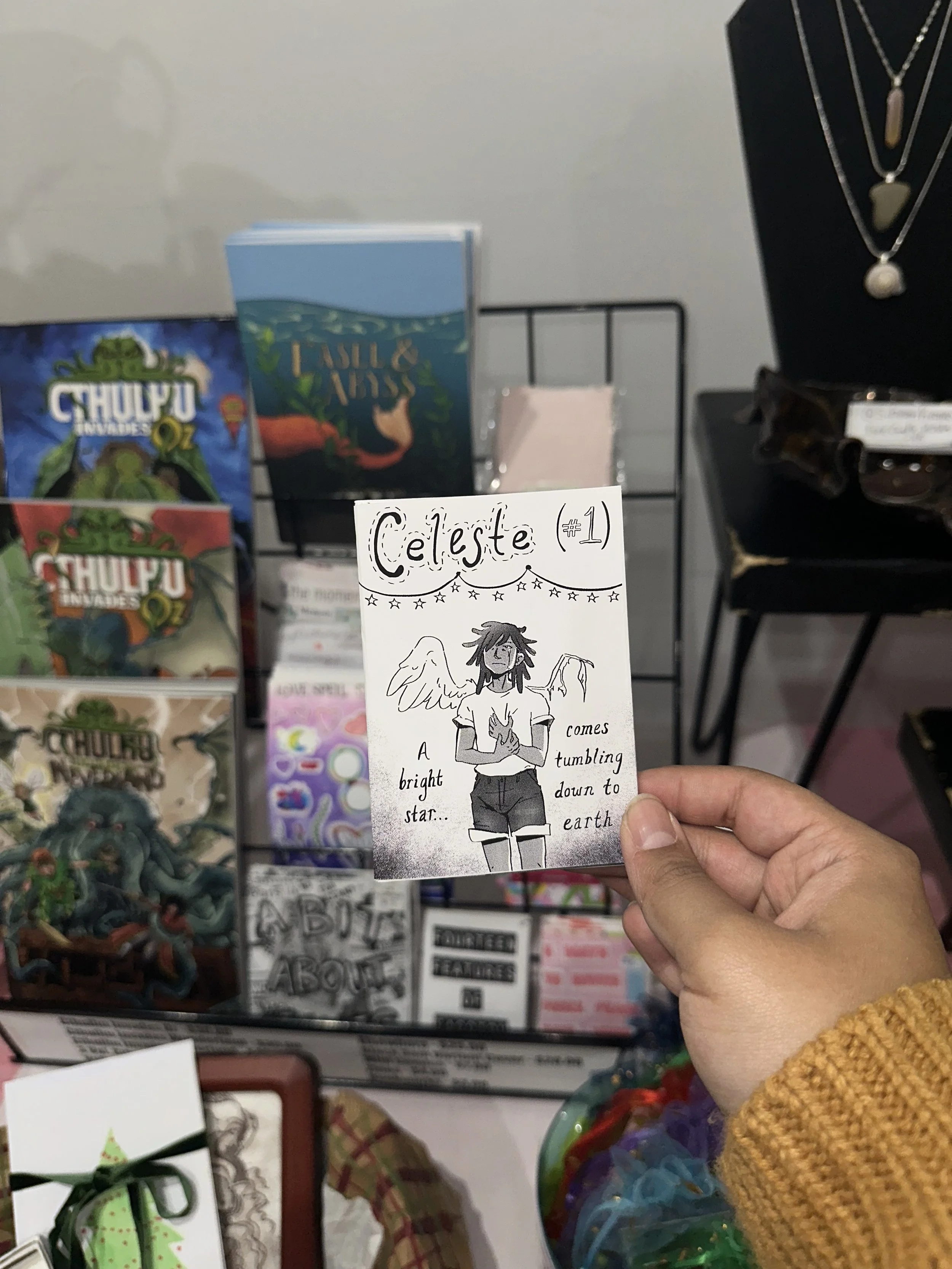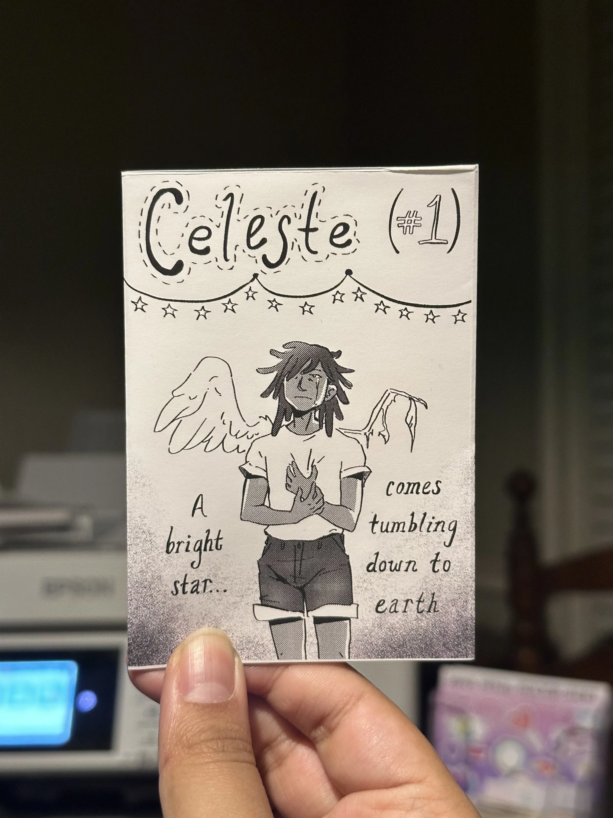 Celeste is an 8-page mini comic zine exploring trauma, survival, and fighting back. With a little bit of celestial and naturalistic metaphor alongside an intimate visual narrative, the story follows Celeste as they navigate the moments before as well as the aftermath of the familiar pattern of harm they are subjected to, and the time everything changes.