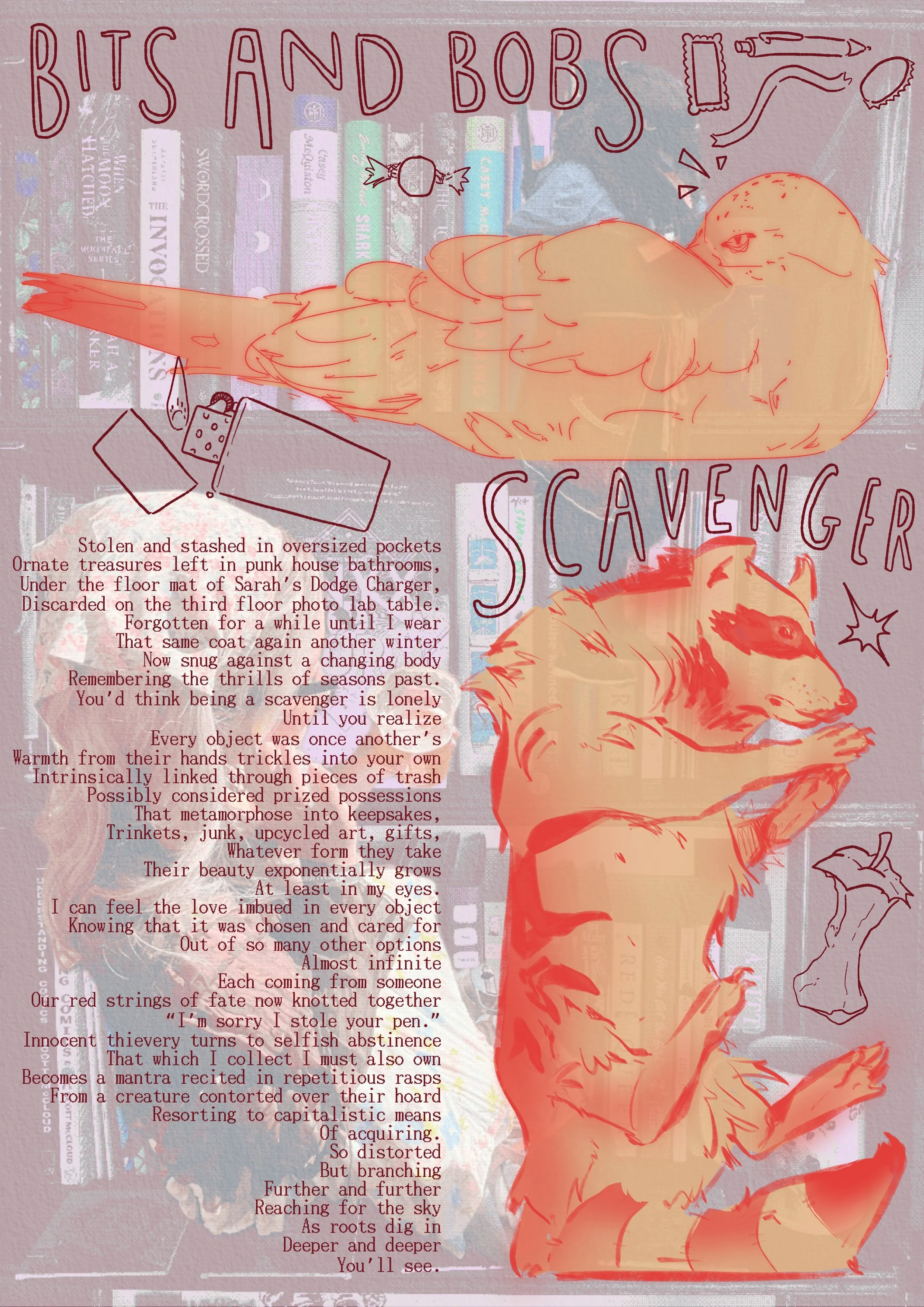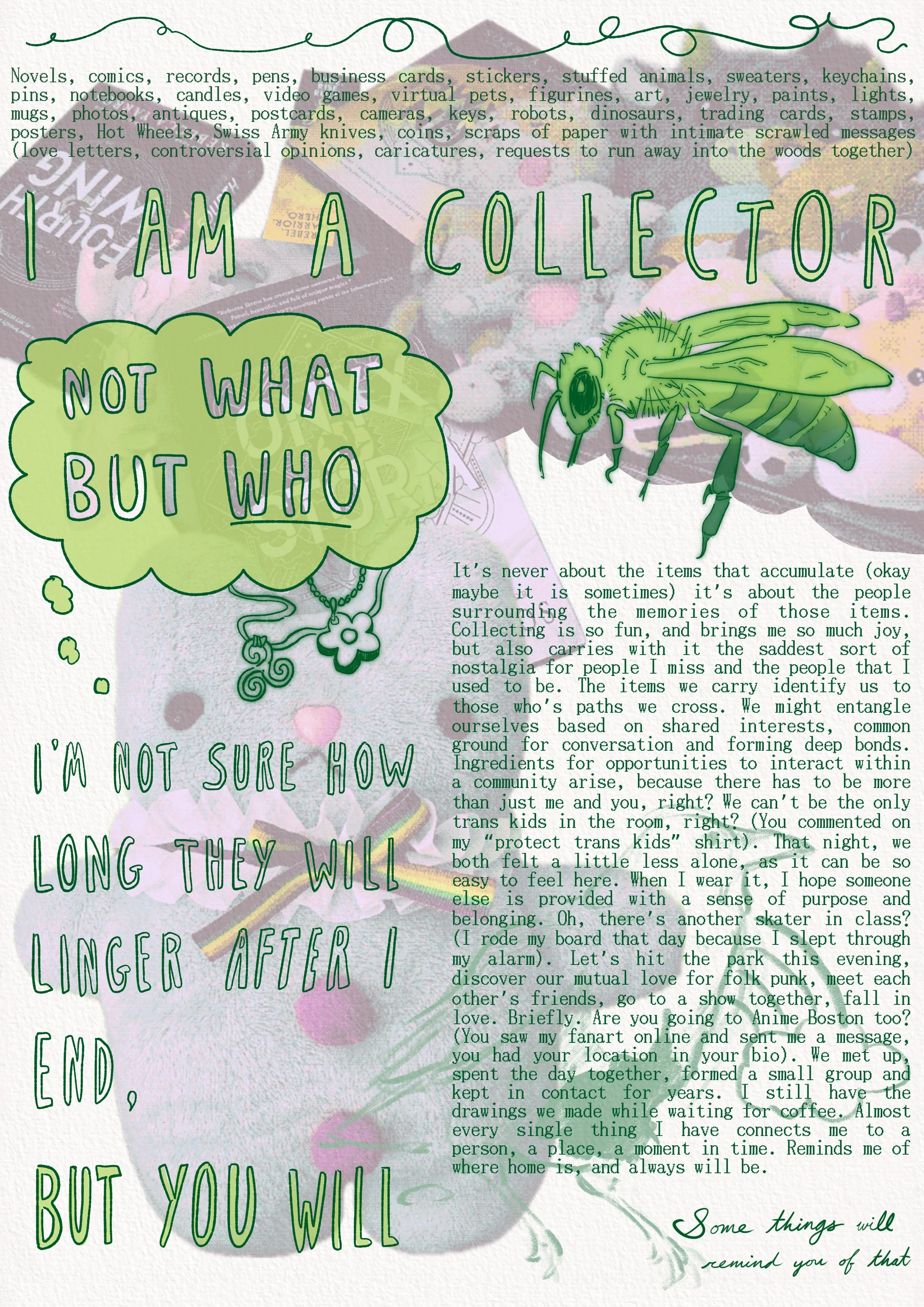 WHEN I DIE WHAT WILL I LEAVE BEHIND? is a booklet zine comprised of drawn on photos and an essay/poetry over collage about memory, identity, and the impulse (or instinct) to collect things. It reflects on what we gather and why, and our reflection in those who acknowledge our paraphernalia. It’s a personal archive, as well as a meditation on collecting as connection. The piece follows a path through nostalgia, queer kinship, and the subtle ways we find each other in a world where self identification can be intimidating, a challenge, and sometimes even dangerous. What begins as a simple scavenger’s instinct unfolds into something weighed down by complex contradictions of philosophy and practice:
